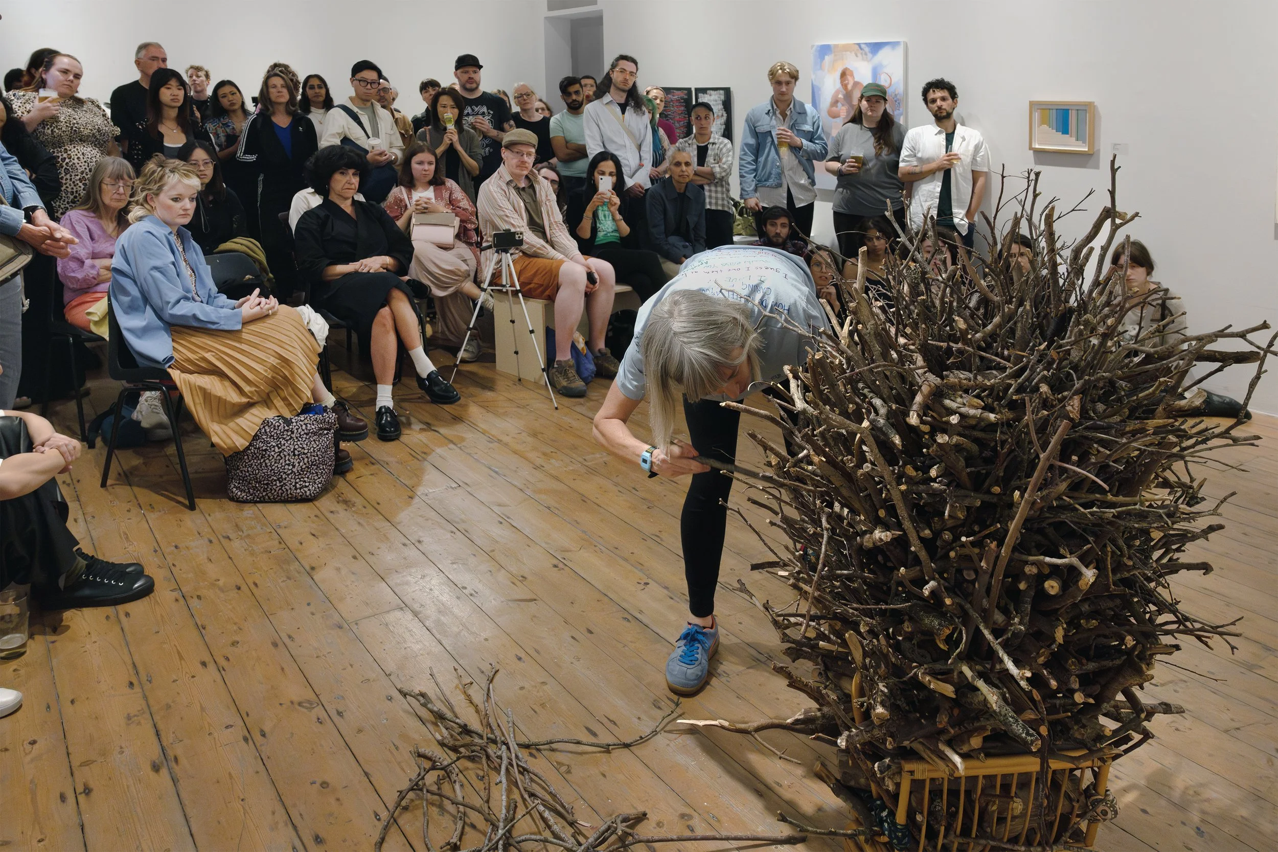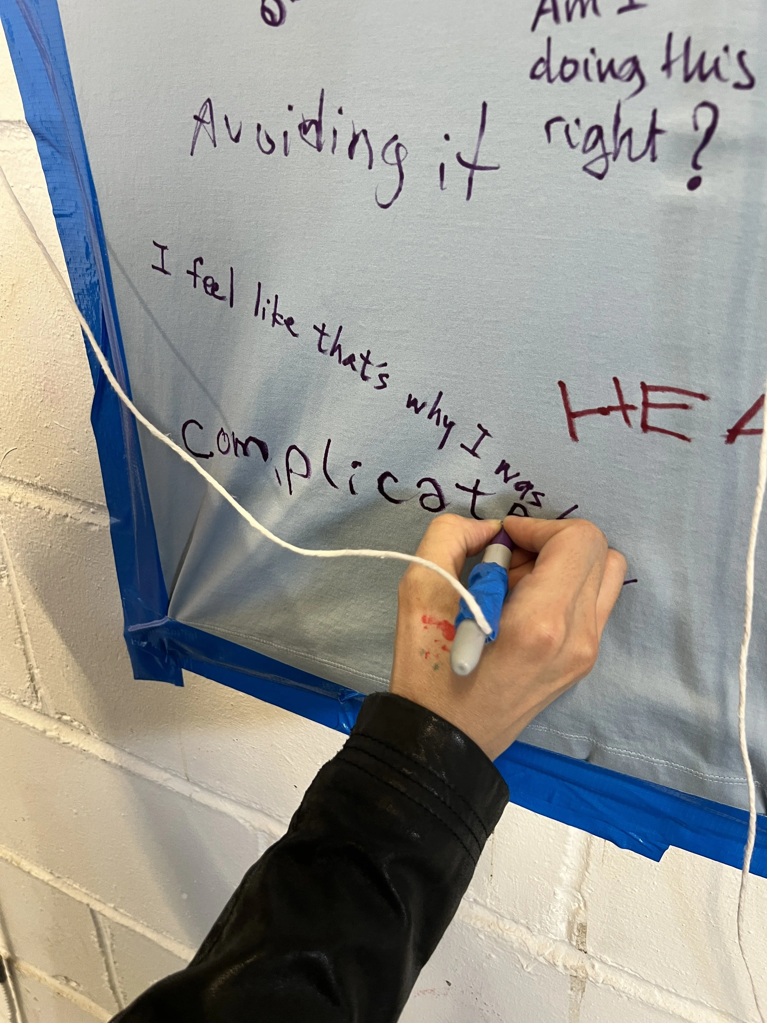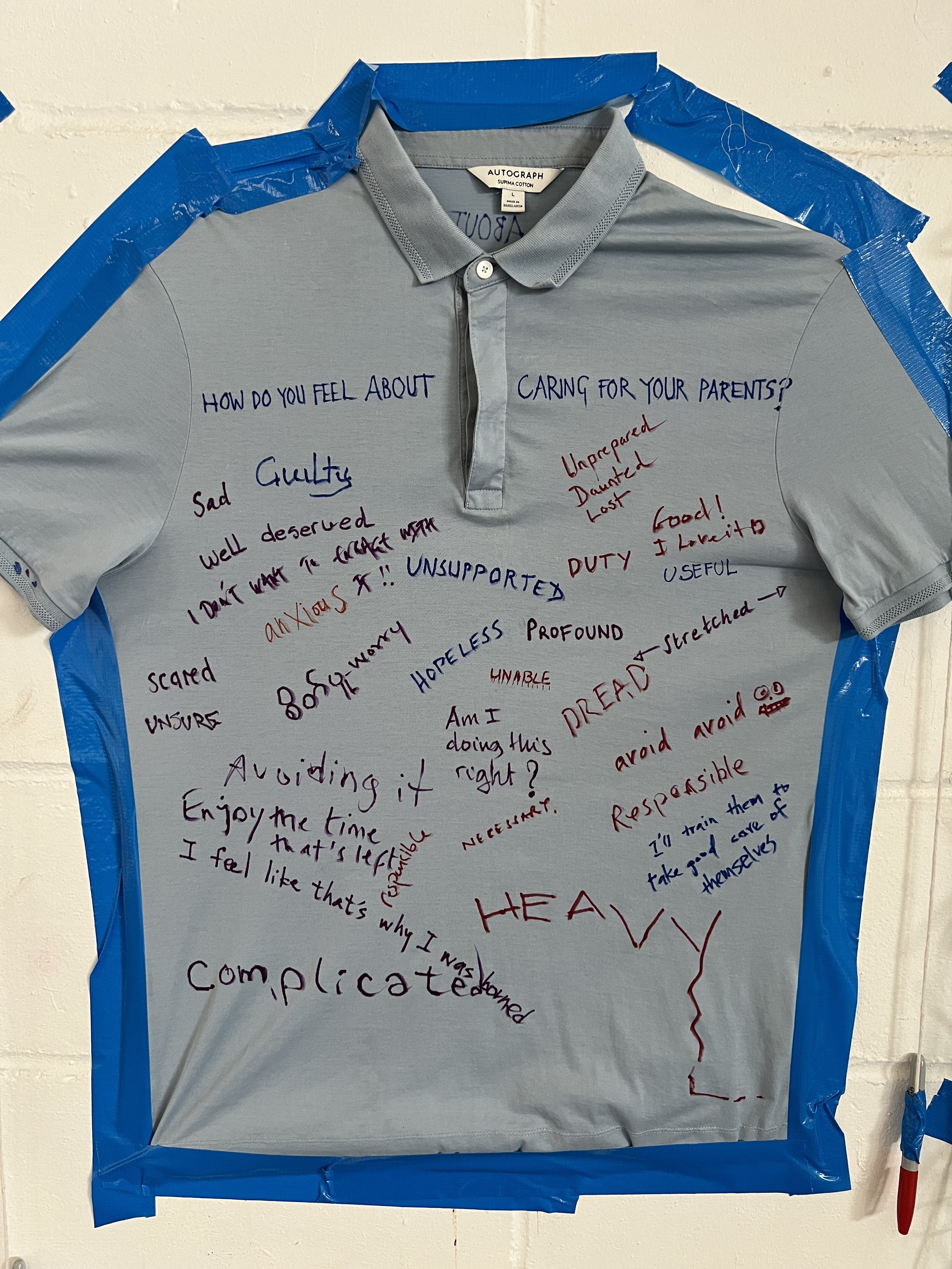 The artist invited people to reflect on care. On her father Michael’s shirts, she wrote: “How do you feel caring for your parents?” She wore the shirt and asked people to respond by writing on her back. Visitors—some carers, others new to the subject—wrote responses on the shirts.