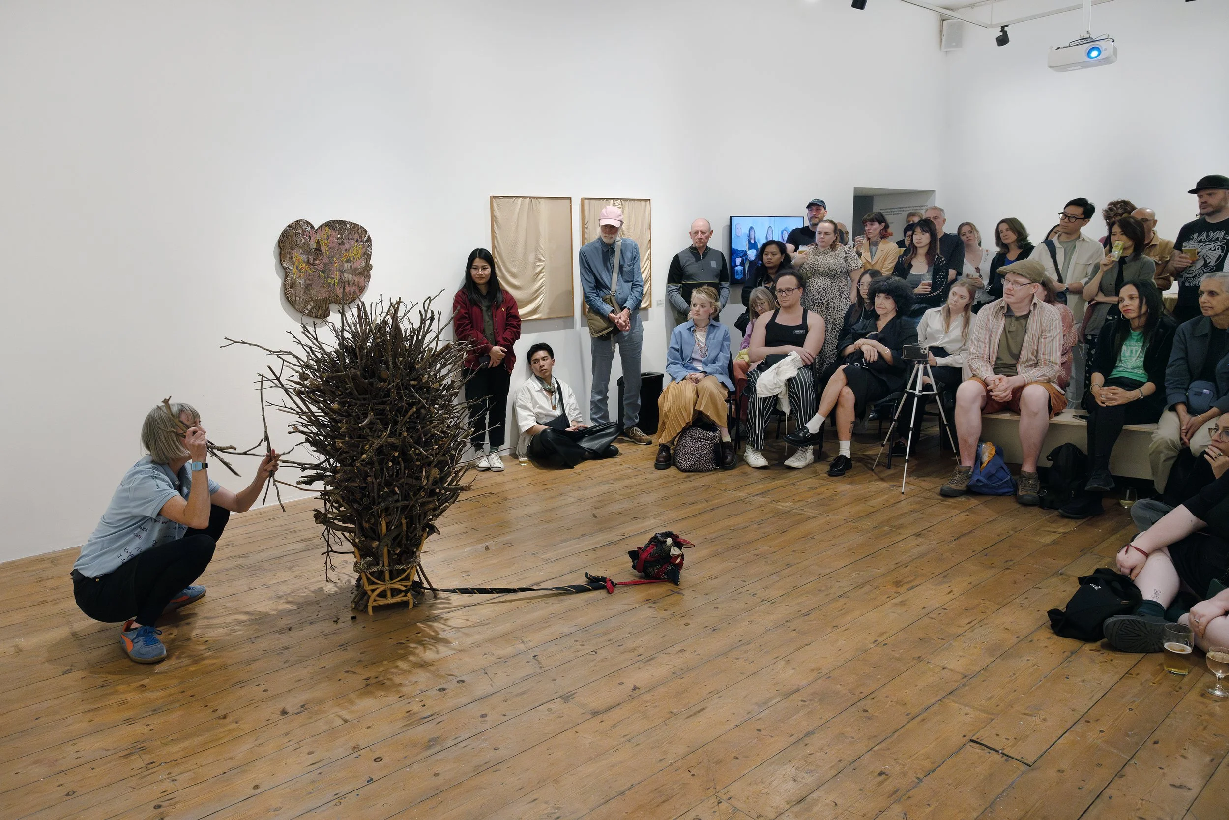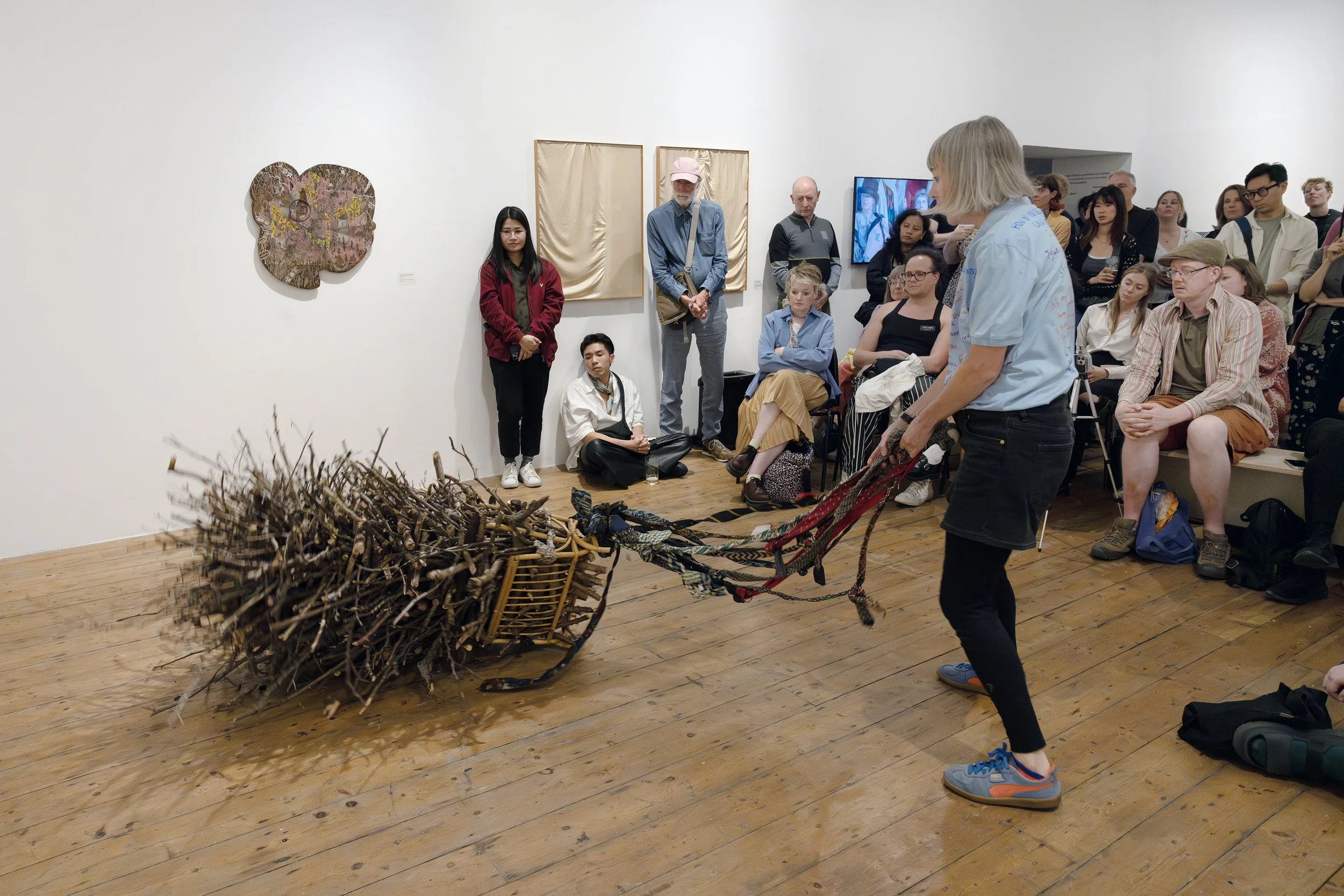 The wooden structure at the centre of the performance is called Wigwam for a Goose’s Bridle and directly responds to Michael’s deteriorating condition and his obsession with stacking twigs. The artist chose to title the structure Wigwam for a Goose’s Bridle as her father, who is from New Zealand, would often repeat this nonsense phrase to her when she asked him endless questions as a child.